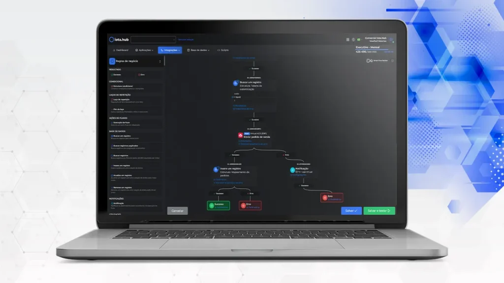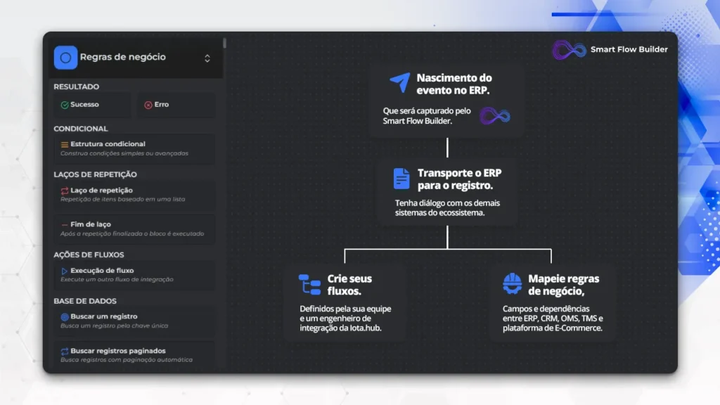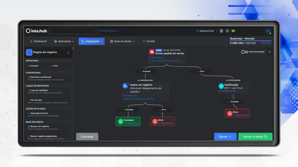 Smart Flow Builder da Iota.hub orquestra integrações entre ERP, e-commerce e CRM, aplica regras de negócio e garante dados confiáveis